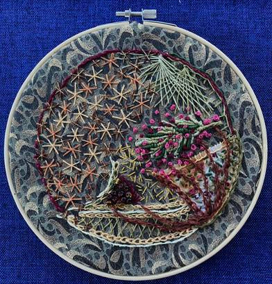 Original abstract embroidery by Janice Arrowsmith. Ready to display or can be framed, 7" diameter.