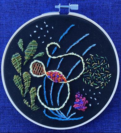 Original abstract embroidery by Janice Arrowsmith. Ready to display or can be framed, 6" diameter.