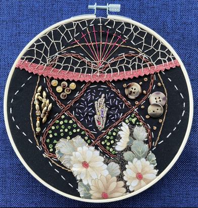 Original abstract embroidery by Janice Arrowsmith. Ready to display or can be framed, 7" diameter.