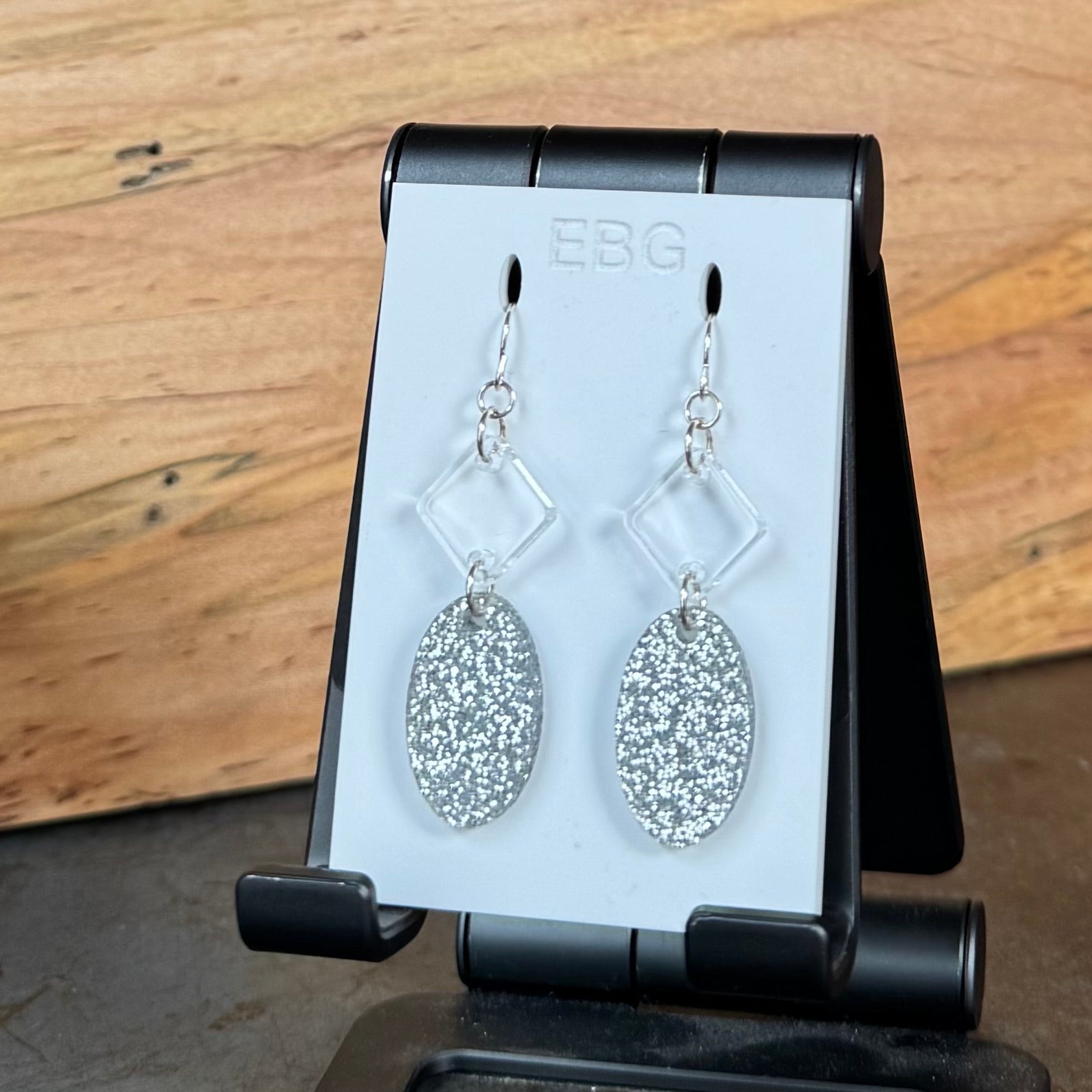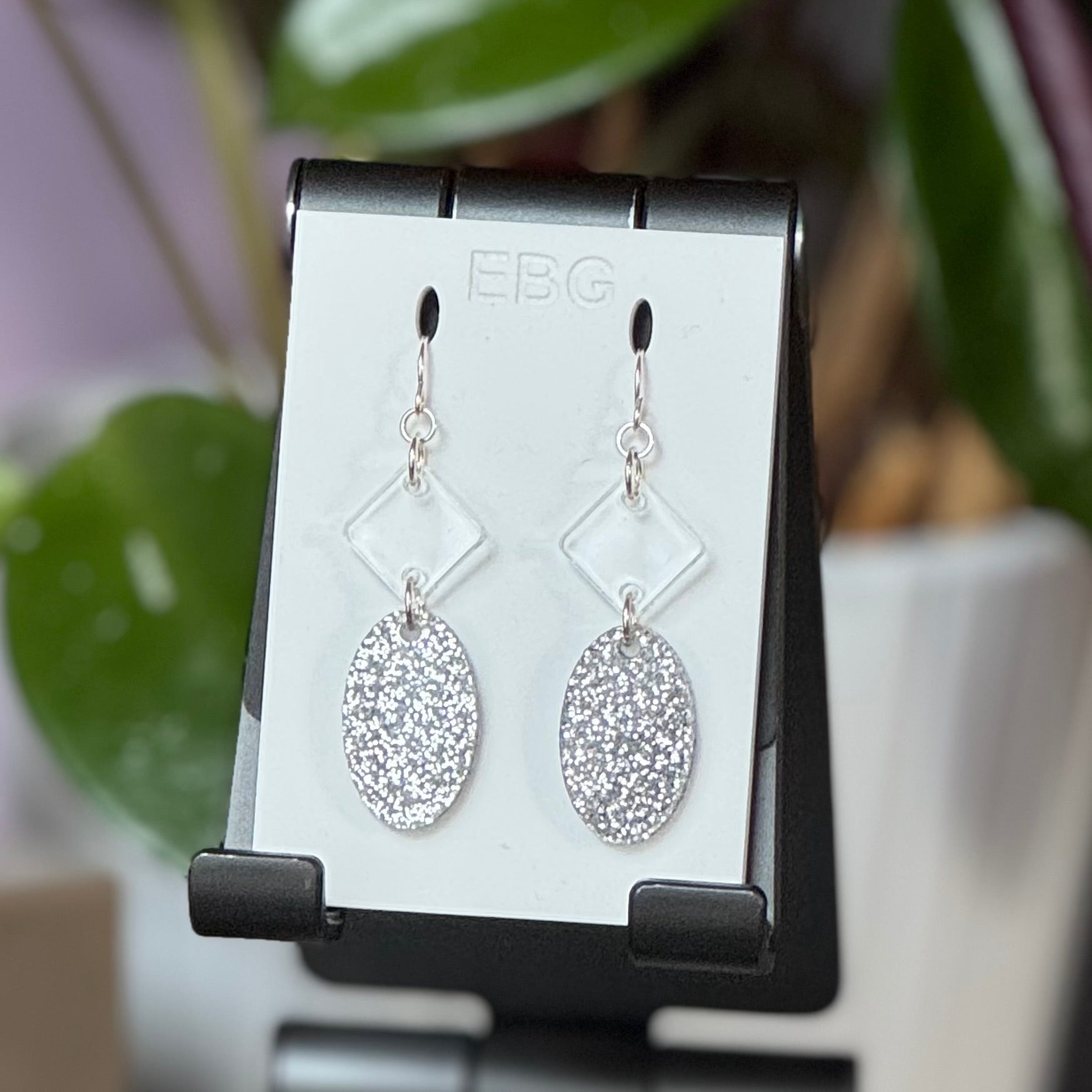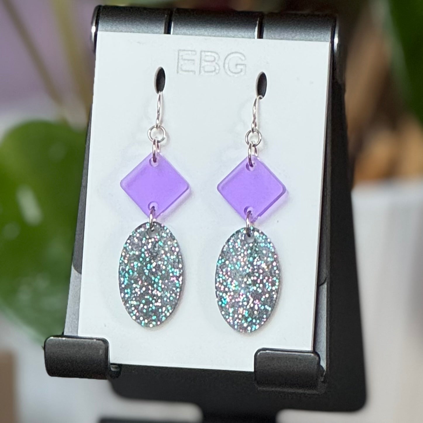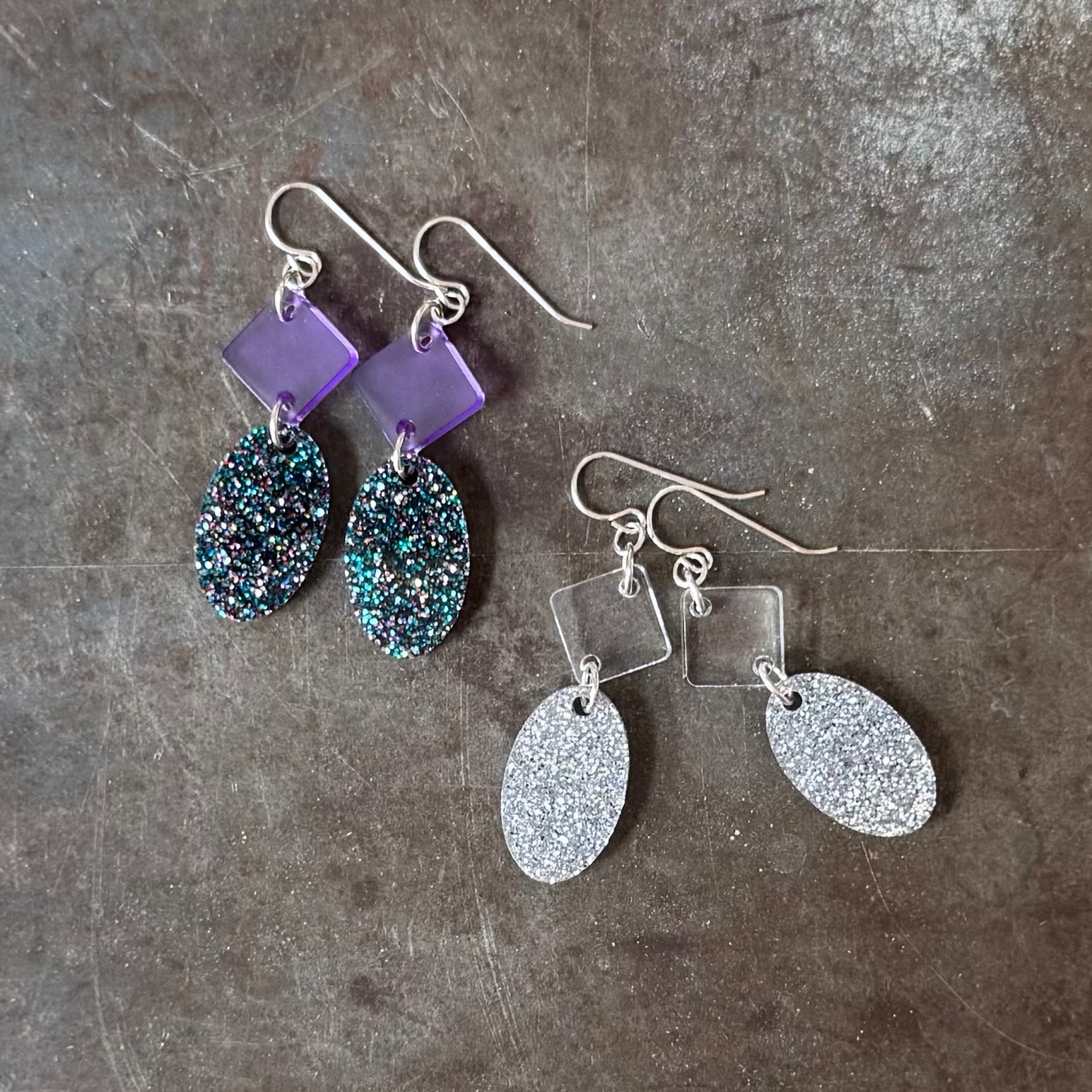 Fun and funky acrylic earrings from Boiler Room Studio. They have great presence, a lot of movement, and are very lightweight.