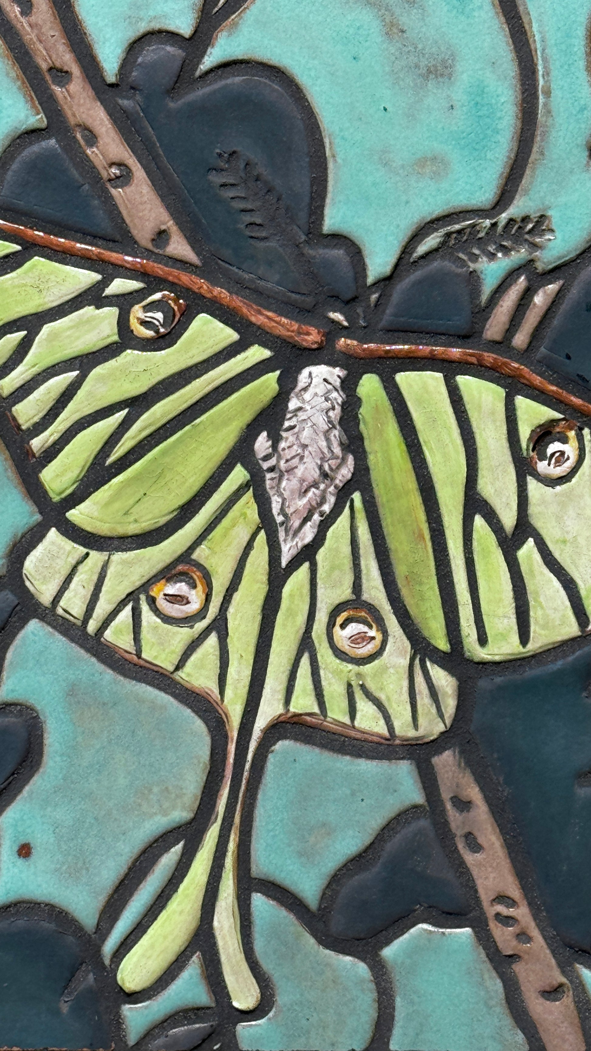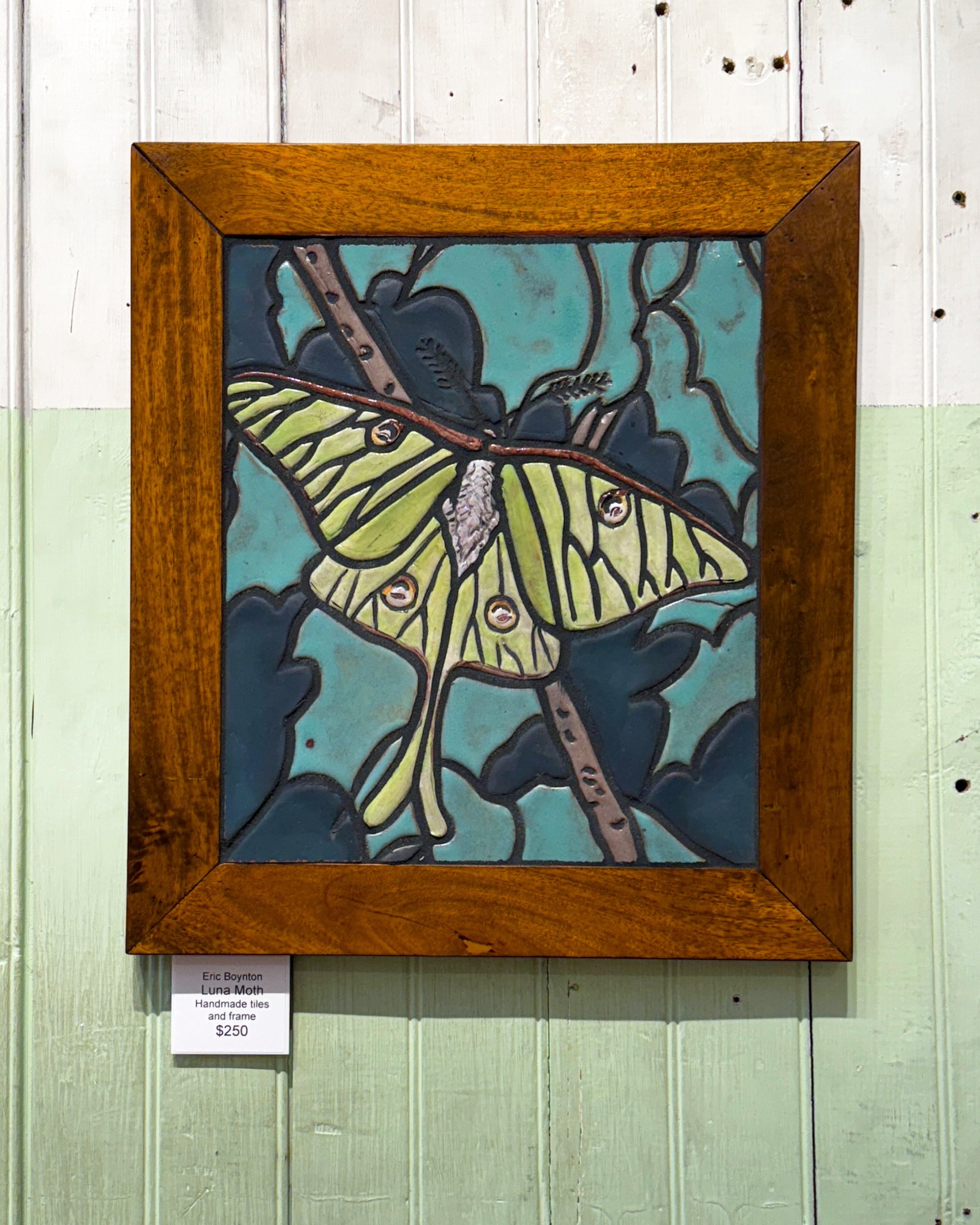 Wall-hanging mosaic featuring handmade tiles and frame by Eric Boynton. Ready to hang on your wall, 17”x15” including handmade framing.