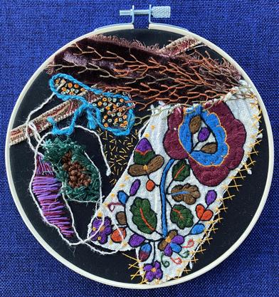 Original abstract embroidery by Janice Arrowsmith. Ready to display or can be framed, 6" diameter.
