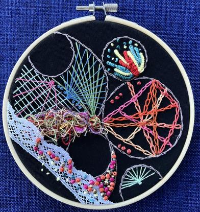 Original abstract embroidery by Janice Arrowsmith. Ready to display or can be framed, 5" diameter.