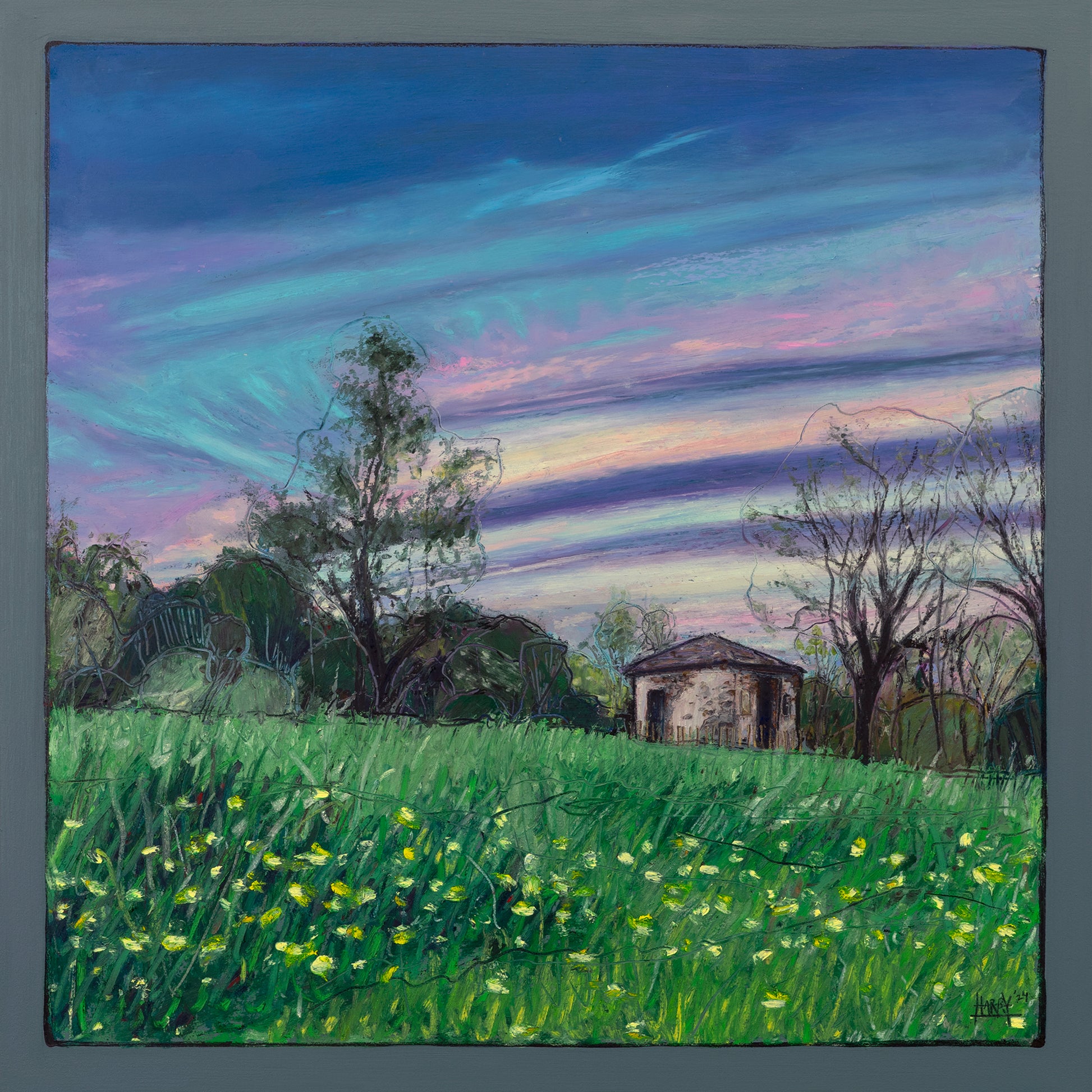 Original oil pastel painting by Harry Boardman. 17”x17” including handmade frame